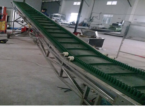 擋邊帶由基帶、擋邊和隔板組成,基帶外觀(guān)同曾通輸送帶,但橫向剛度更大:擋邊為波浪狀:陋板按其不 的斷面可分為T(mén)型、C型和TC型。T型適用于傾角β≤40°場(chǎng)合,C型適用于傾角β>40°且物料流動(dòng)性較好的場(chǎng)合,TC型適用于傾角β>40°,物料粘性較大,粘度較大的場(chǎng)合。